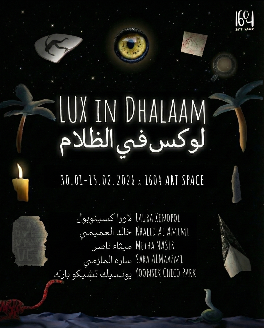 LUX in Dhalaam.لوكس في الظلام brings together five UAE-based artists who have treated the long, narrow gallery like a portal. Dhalaam, derived from the Arabic ظلام meaning shadow or darkness, is imagined as a parallel realm where light miscommunicates: it bends, listens, gets the message wrong, then tries again.